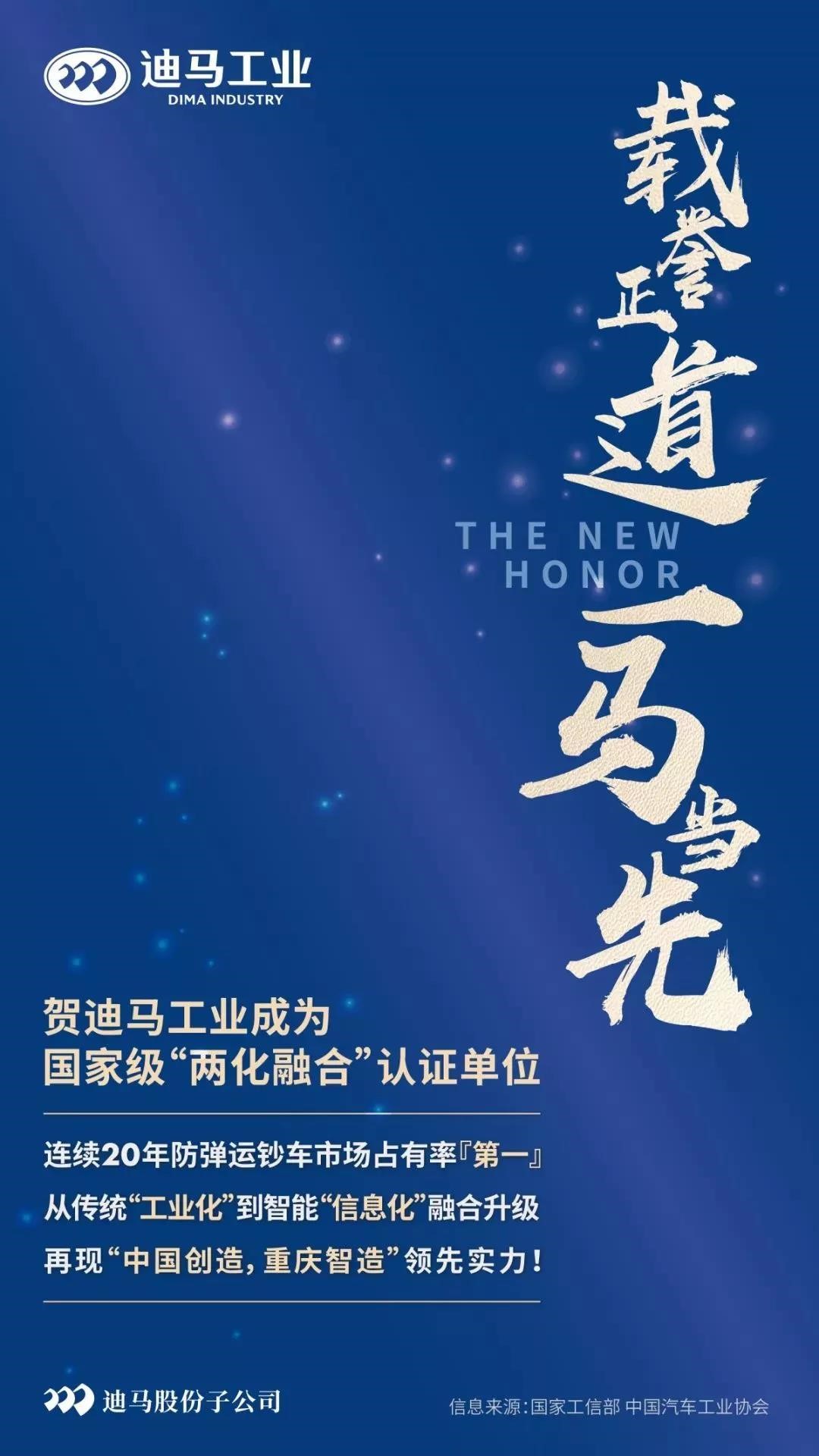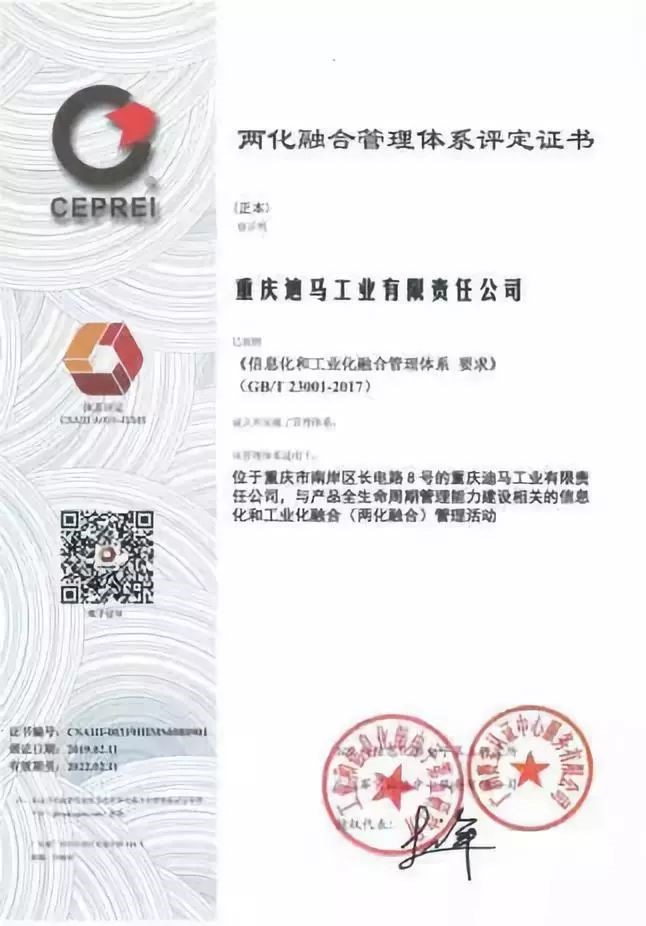 近日,迪馬工業(yè)獲得了由國家工信部、中國汽車工業(yè)協(xié)會發(fā)布的《兩化融合管理體系評定證書》,作為特種車領域的標桿企業(yè),迪馬工業(yè)始終保持行業(yè)的領先地位。